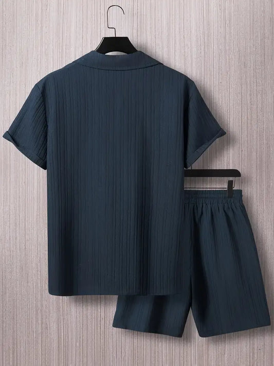 Navy Blue Strip Design Mens Half Sleeves Cords Cotton Material